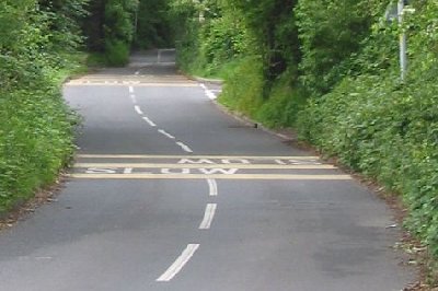 If you can't widen it, just paint it! Here the council have written the word "SLOW" on the tarmac every fifty yards and laid down some yellow rumble strips.